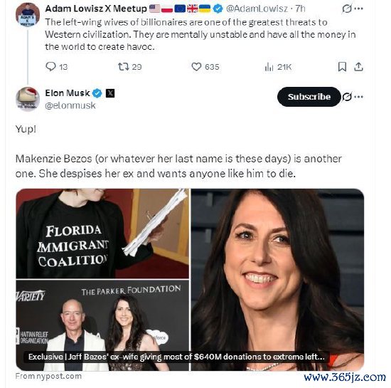 这不是马斯克第一次品评麦肯王人·斯科特的慈善捐赠。2024年3月,马斯克就曾在X上发帖炮轰斯科特,那时有报谈称,自与贝索斯仳离以来,斯科特捐赠的165亿好意思元大都给了触及种族和性别气愤问题的非谋利组织。马斯克评述称:“‘厌烦前夫的超等富豪前妻’,应该被列为‘西方细致铩羽的原因’之一。”